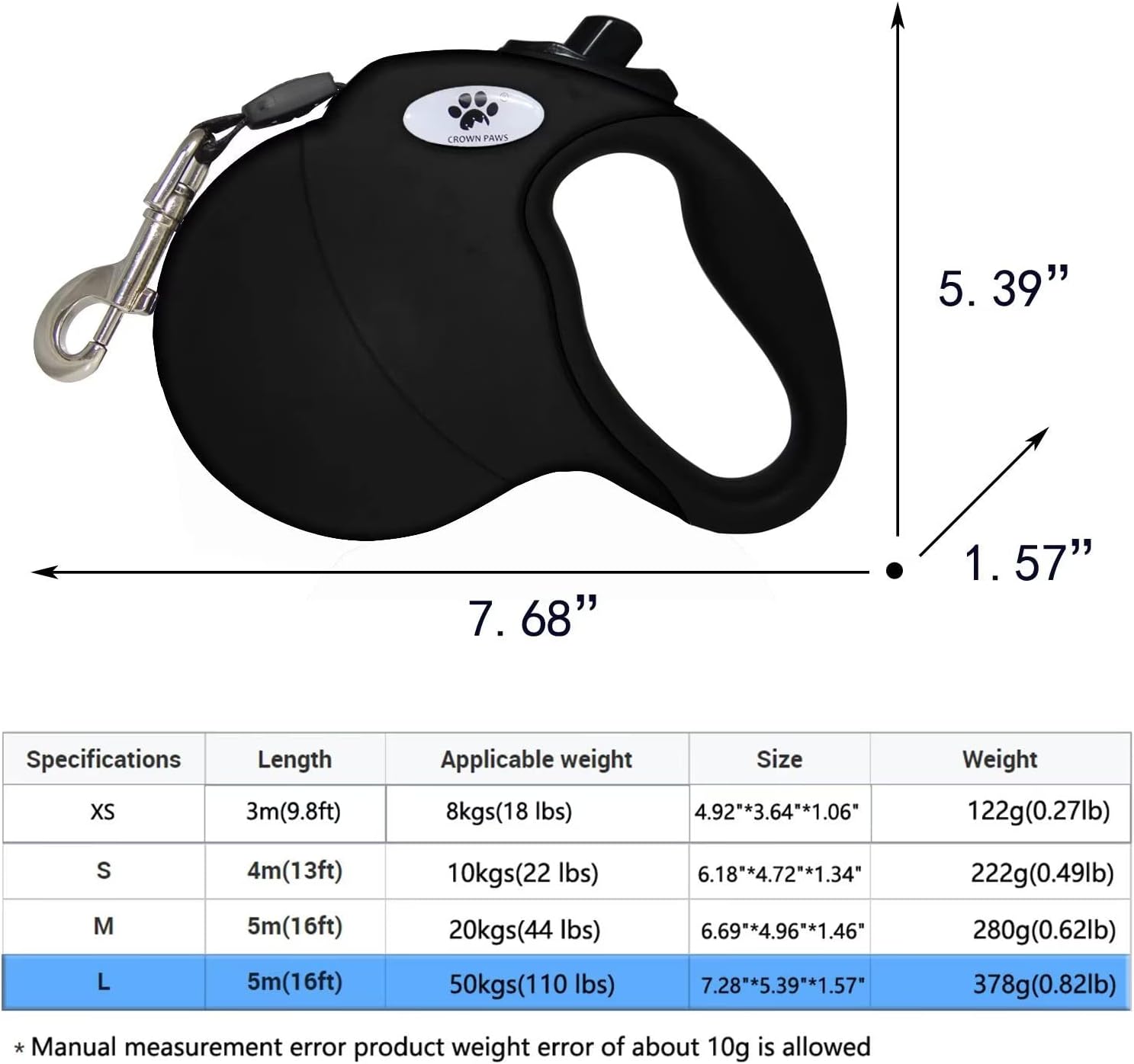 Size and Color of Leash:The CROWN PAWS Comfort Retractable Dog Leash in BLACK ,Tape 16 ft/5 m For dogs up to max 110 lbs(48.9kgs)