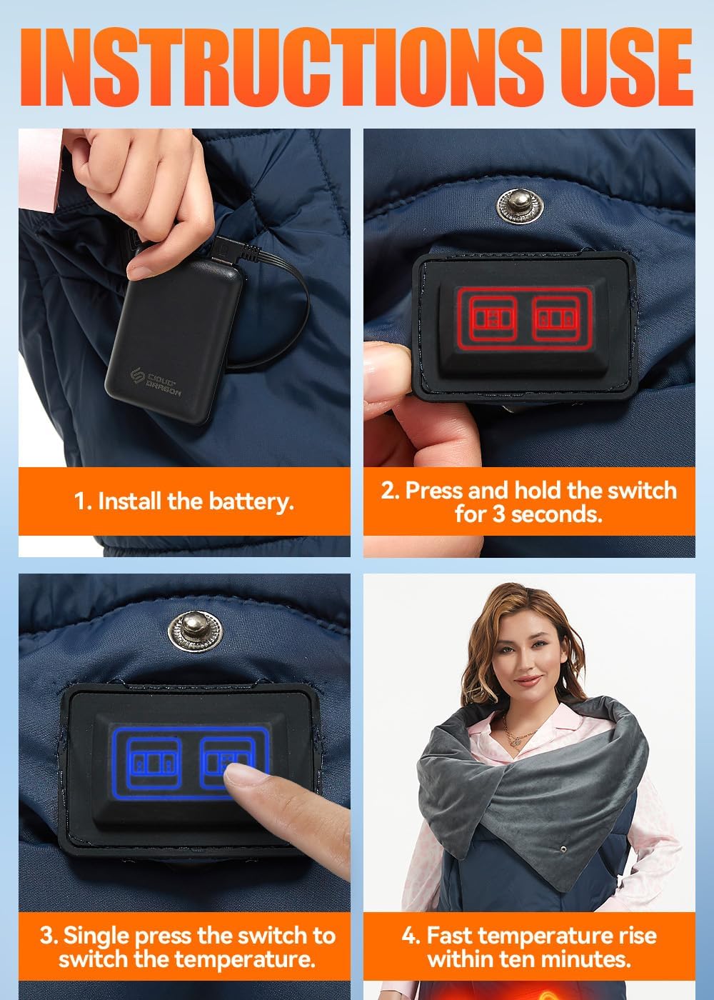 💨【WARM AND COZY HEATED BLANKET】: Heated blanket shawls are high-quality carbon fiber heating elements with 3 heating levels to generate consistent heat to help keep the body warm. Give you firm support in chill weather, and can stay warm in all outdoor activities like travel. With the 20000mAh battery, the runtime is up to 5:00-15:00 hours. Note: Our heated blanket comes in a size of 43×52 in. The size may not always be a perfect fit for individuals with varying body weights.