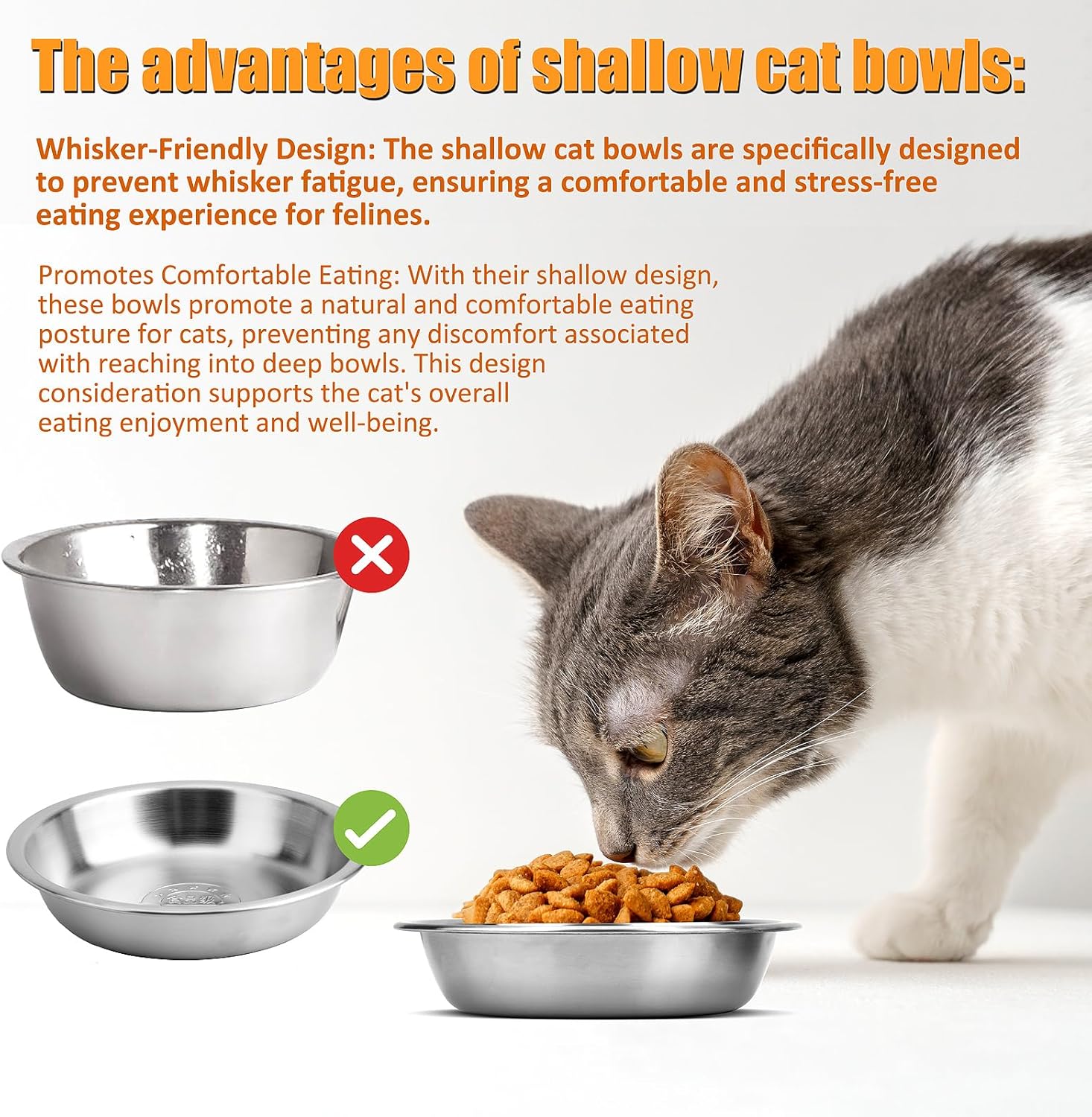 Whisker-Friendly Design: Engineered with shallow, wide metal cat bowl to prevent whisker fatigue, ensuring your cat eats comfortably. The shallow design encourages easy access to food, reducing mealtime stress and discomfort often associated with deeper bowls