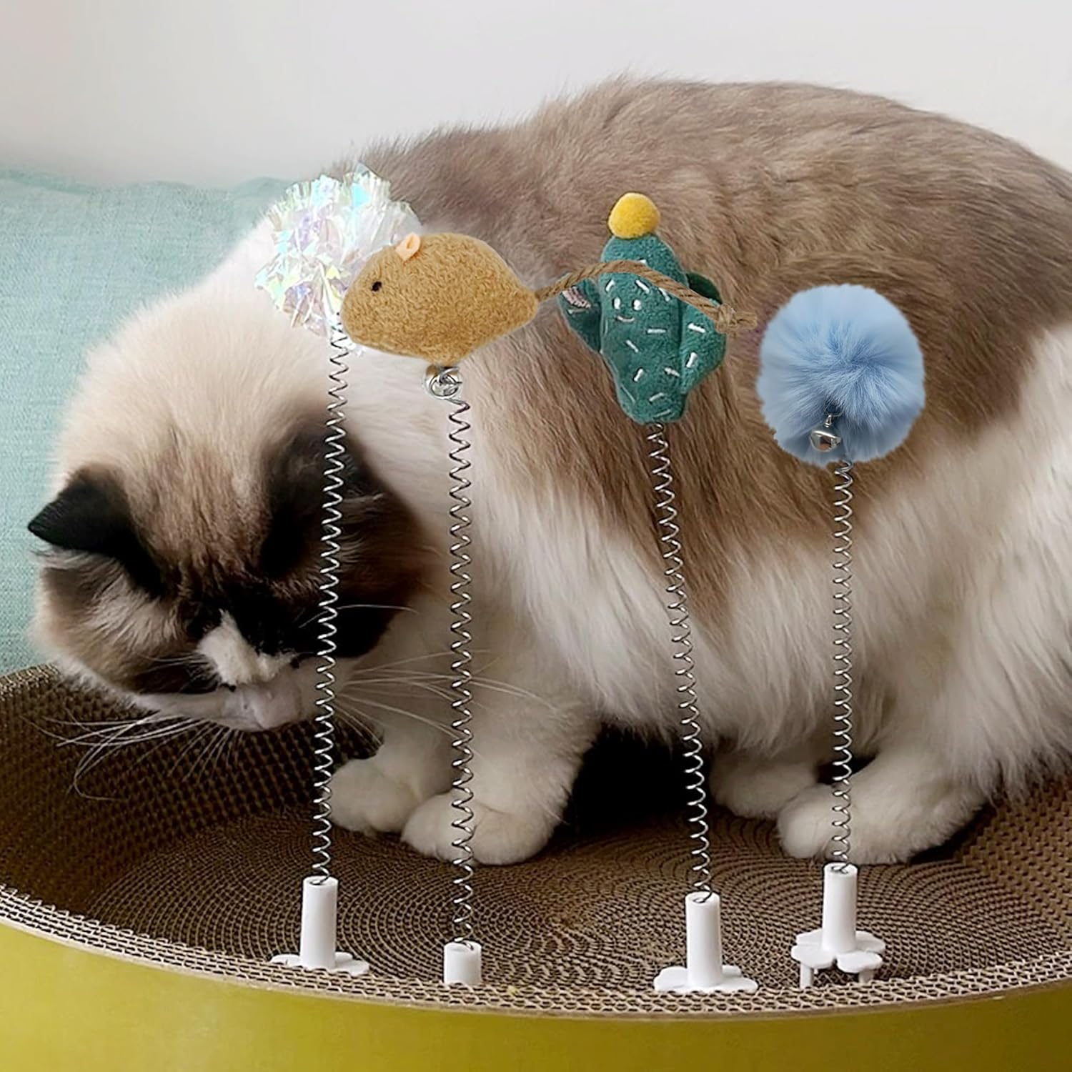 At first review, these were a great idea. Clever and seemed to be sturdy when inserted into the cat scratcher. The individual wands with toy at top seem to be durable and most pieces have survived 3 kittens.They initially fit snug and stay in the cat scratcher…until they don’t.Focused kittens were able to pull our the small wand and then bite off the plastic legs.Then there are large holes in the cat scratcher that keeps one from using that area for another want to be inserted.