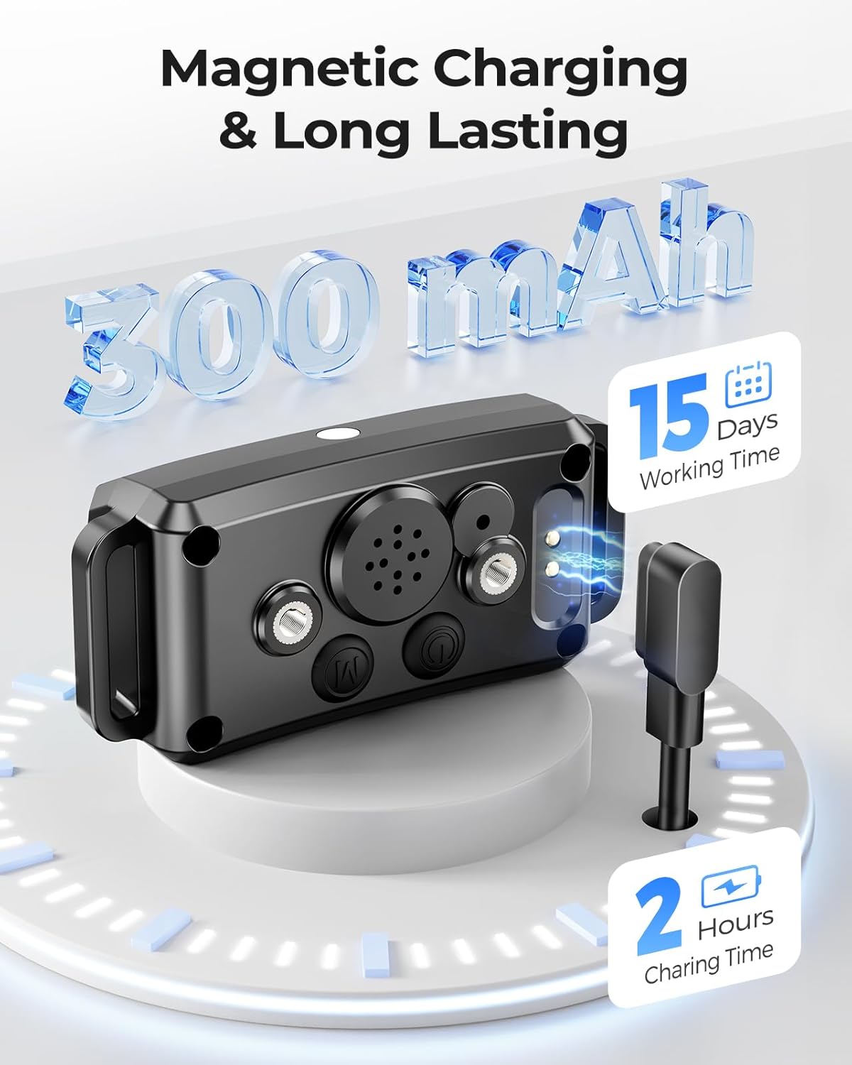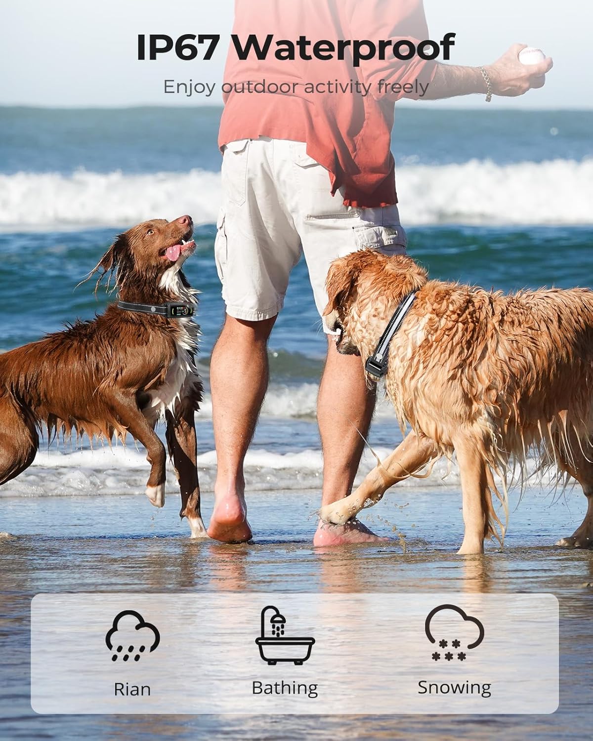 Long Battery Life & IP67 Waterproof Design: The bark collar for large dogs fully charges in just 2 hours and lasts up to 15 days on a single charge. With an IP67 waterproof rating, it’s perfect for training sessions by the pool, at the park, on the beach, or in your backyard, no matter the weather