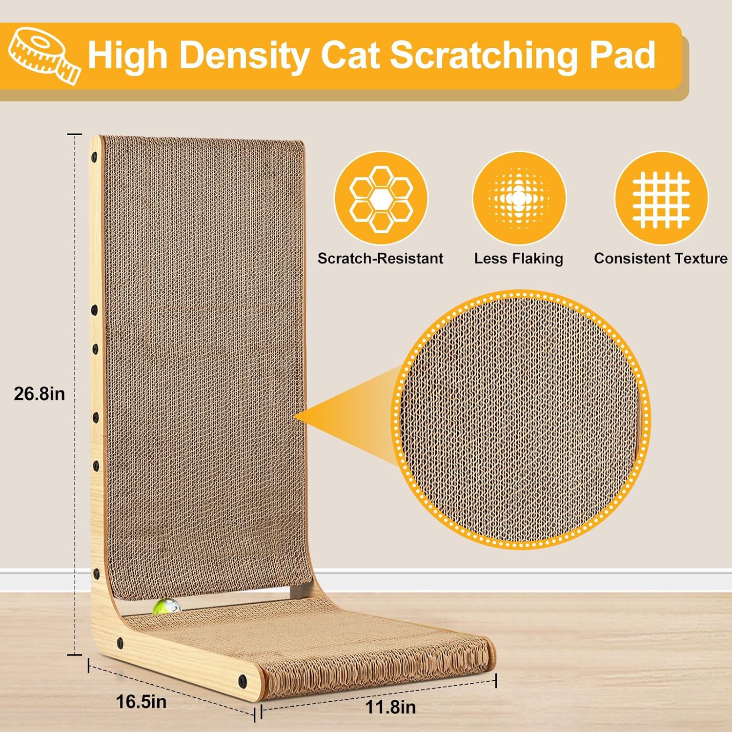 Cat Scratcher L Shape Large, 26.8 inch Cat Scratching Pad for Indoor Cats, Cardboard Cat Scratch Pad with Ball Toy