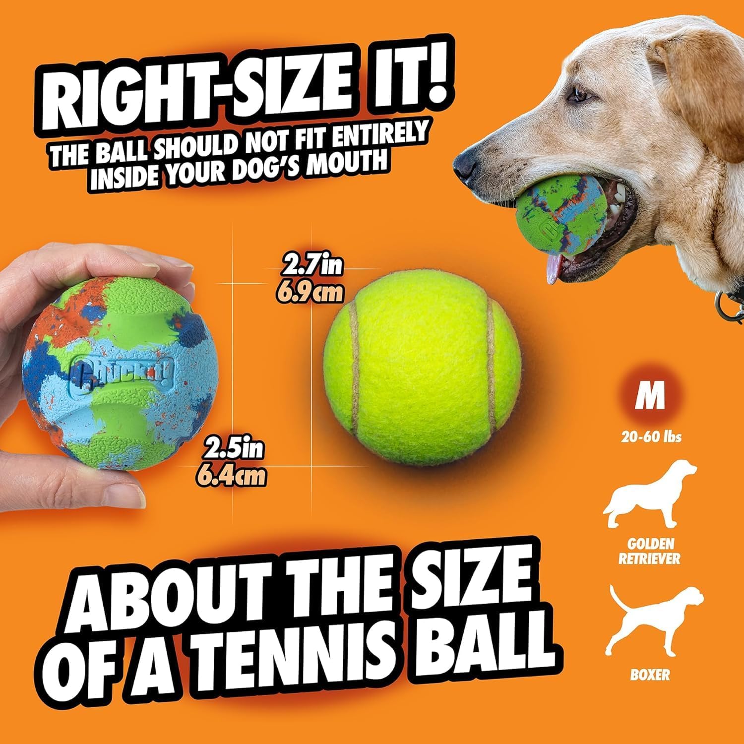 Sizing matters: Size medium measures 2.5″ in diameter and is best suited for dogs weighing 20-60 lbs. The ball should be small enough for your dog to carry, but large enough that the ball can’t completely fit in their mouth; When in doubt, buy a size up!