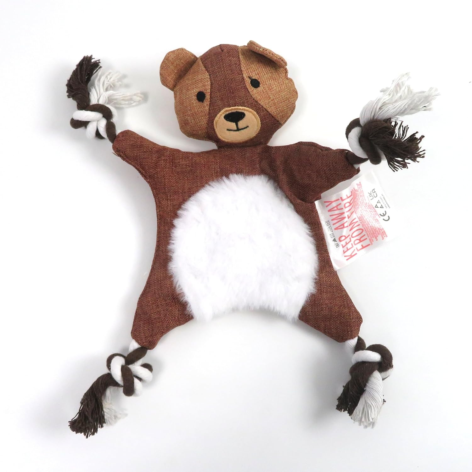 This is a fun dog toy for chewing & playing tug-of-war. The head is filled with batting, the torso with very crinkly paper, and there are two ropes, one extending from hand to hand and the other from foot to foot. However, after only a few minutes of tug-of war it’s already tearing apart–the ropes are the only strong parts; I suspect my aggressive chewer won’t take long to completely destroy this sweet little bear. Comes with a warning tag to “keep away from fire” which I will remove before the kiddo has a chance to tear it off. Product of Poland.Update: Second photo was taken after only two half-hour play sessions involving tug-of-war & fetch.