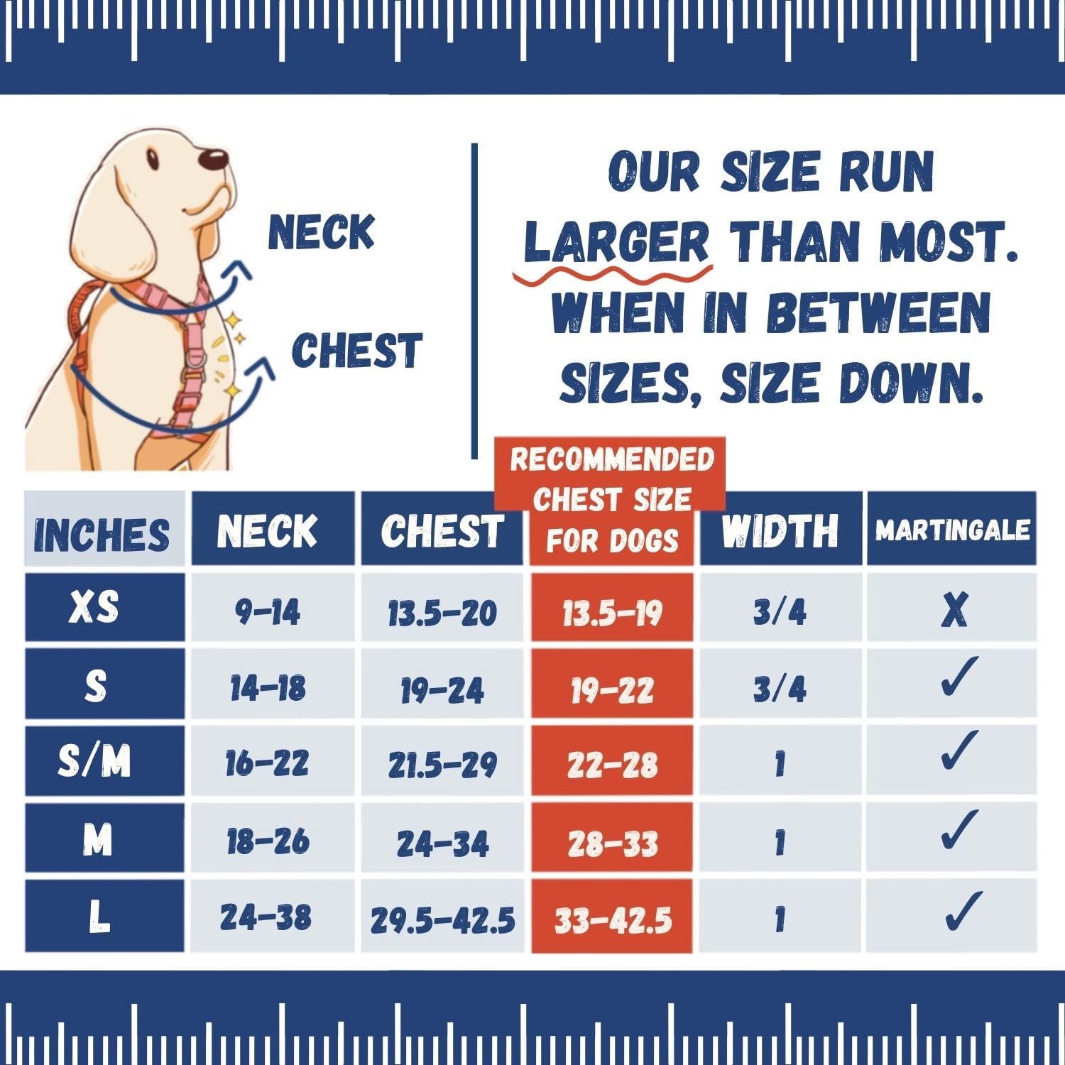 I love this harness for my big dog. I have struggled to find something that gives me control, is comfortable for her and is escape proof.This harness checks off all the boxes and it’s super cute too. My dog is very comfortable and since this harness is light weight (but heavy duty, don’t ask me to explain lol) she can wear it during hotter expeditions and I find that she’s much more comfortable.The martingale clip is perfect too for working on her leash skills. She definitely still pulls but I am way more in control now.I got her a M since they stated their sizing runs larger. It fits like a gem. For reference my dog is: 46lb, pittie mix, Chest 28in, Neck 20inUpdated to add: the harness has been through pool parties, hikes and general wear and we have had zero issues. Still has sturdy as ever and my dog is actually excited to wear her harness now.