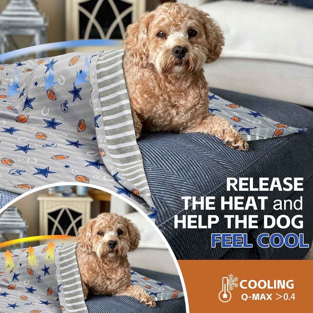 【DOG COOLING BLANKET】:On one side is Cooling-fabric, which helps to dissipate sweat, no sticky or sultry feeling that keep you cool and dry during hot summer night. And the touch is soft and smooth like the silk. While the other side is made of 100% natural cotton that offers a warmth effect for all Seasons.