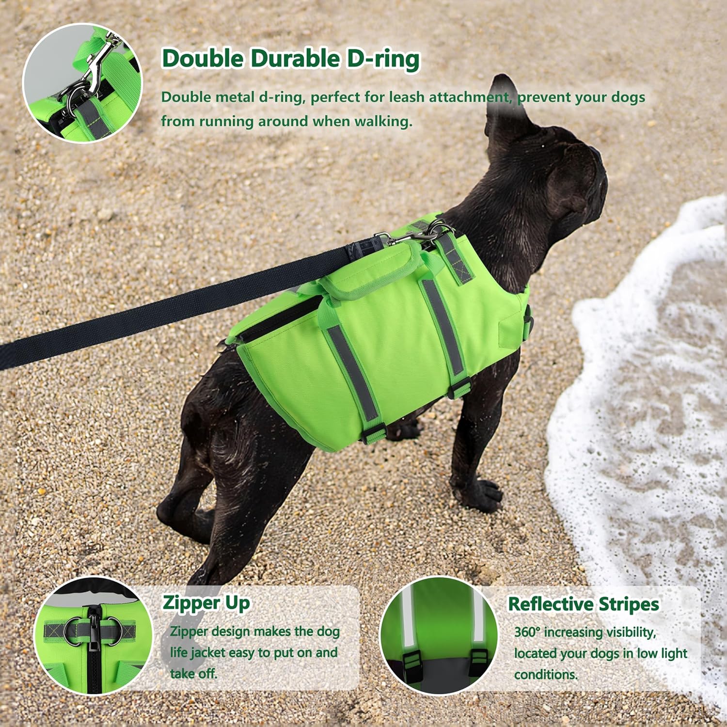 🐶【D-Ring】There is durable heavy duty D-ring hook on the back of the dog life vest, perfect for attach a dog leash to prevent your dog from running around while walking.
