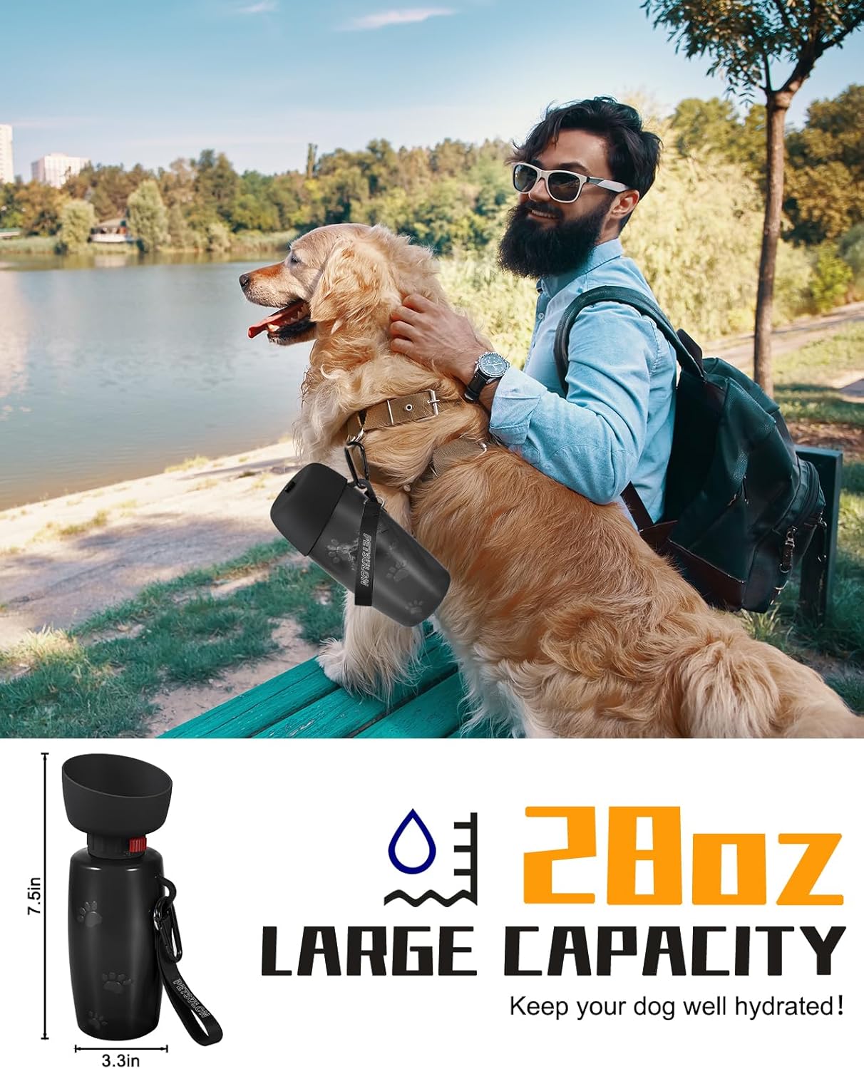 LARGE-CAPACITY DESIGN: Our dog water bottle dispenser boasts an outstanding capacity of up to 28oz, ensuring your pet has enough water for a full day of outdoor play. Let every outdoor adventure be worry-free, and enjoy the joyful moments spent with your dog to the fullest