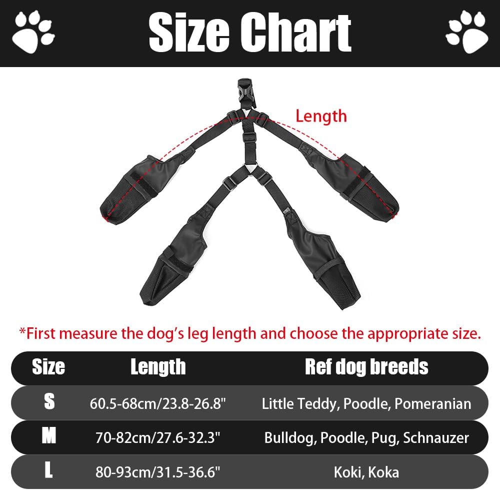 Widely Used: suitable for small and medium-sized dog breeds, such as: Teddy, Poodle, Pomeranian, Bulldog, Poodle, Pug, Schnauzer, Corgi, Cocker Spaniel, etc. Before purchasing, you need to measure the dog’s leg length first and choose the appropriate size according to the size chart.