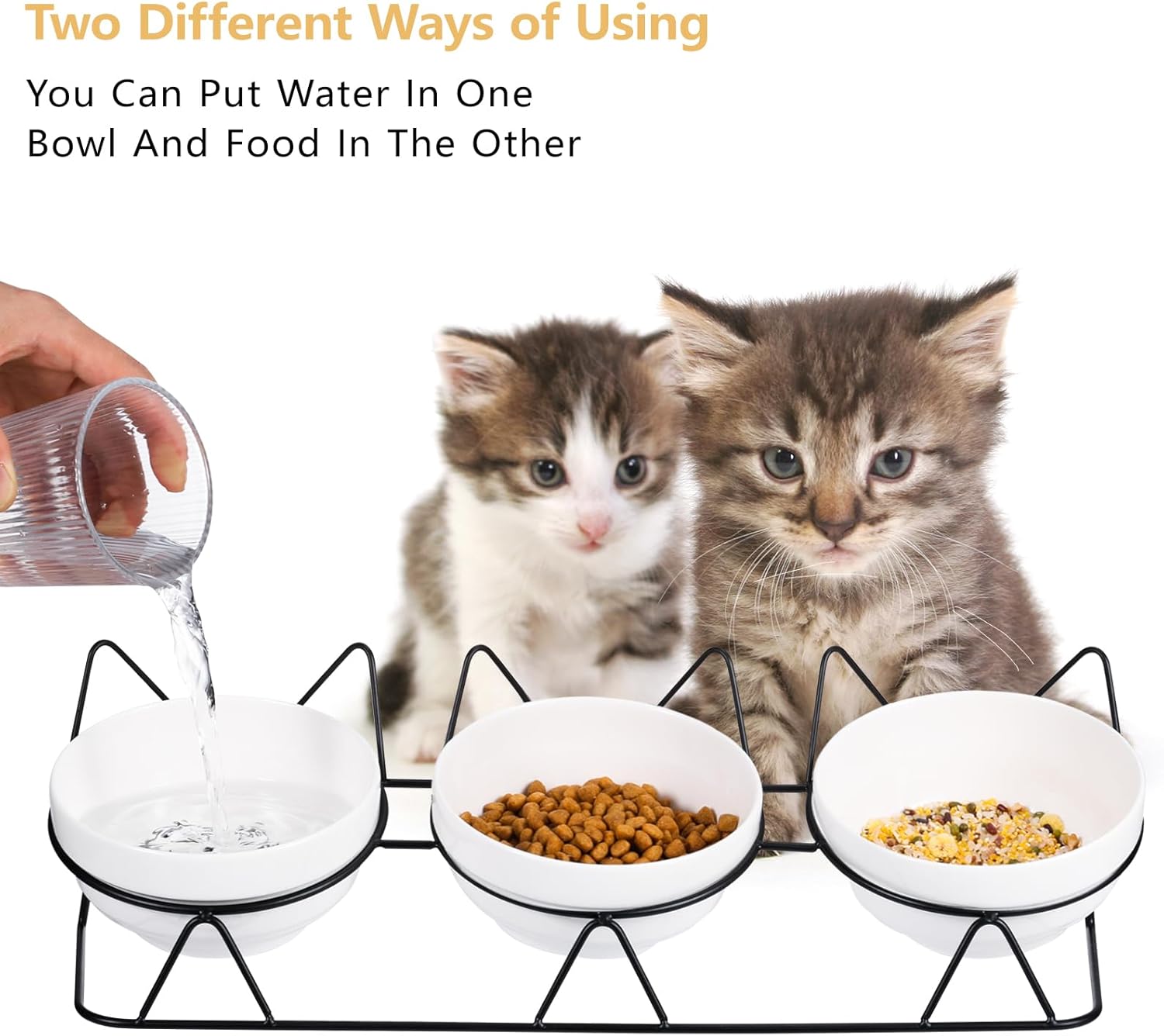 3-Bowl Set: The set includes one small bowl for water, one for dry food, and one for wet food. It can hold enough food and water for a whole day, making feeding very convenient.
