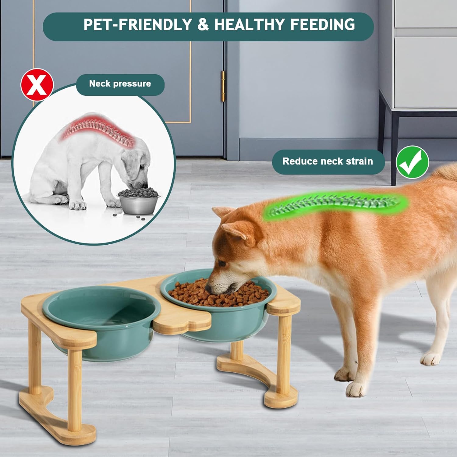 [Stable and Non-slip design]: The natural bamboo four-legged stand prevents tipping over, while the rubber feet on the bottom of the stand prevent it from sliding while your pet eats. The thick ceramic material provides additional stability and durability.