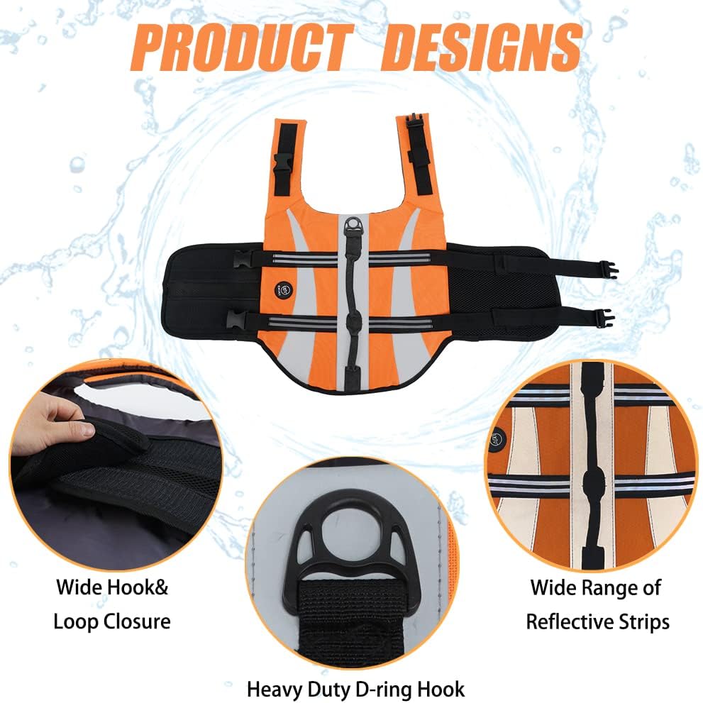 General Pratical Designs: The dog floatation vest is designed with adjustable belts, quick-release buckles and underbelly with Wide Hoop&Loop areas, which make dog safety lifesaver easy to put on and take off, and create a most comfortable state for your dogs. And the heavy-duty D-ring hook of the pet life jacket is perfect for dog leash.