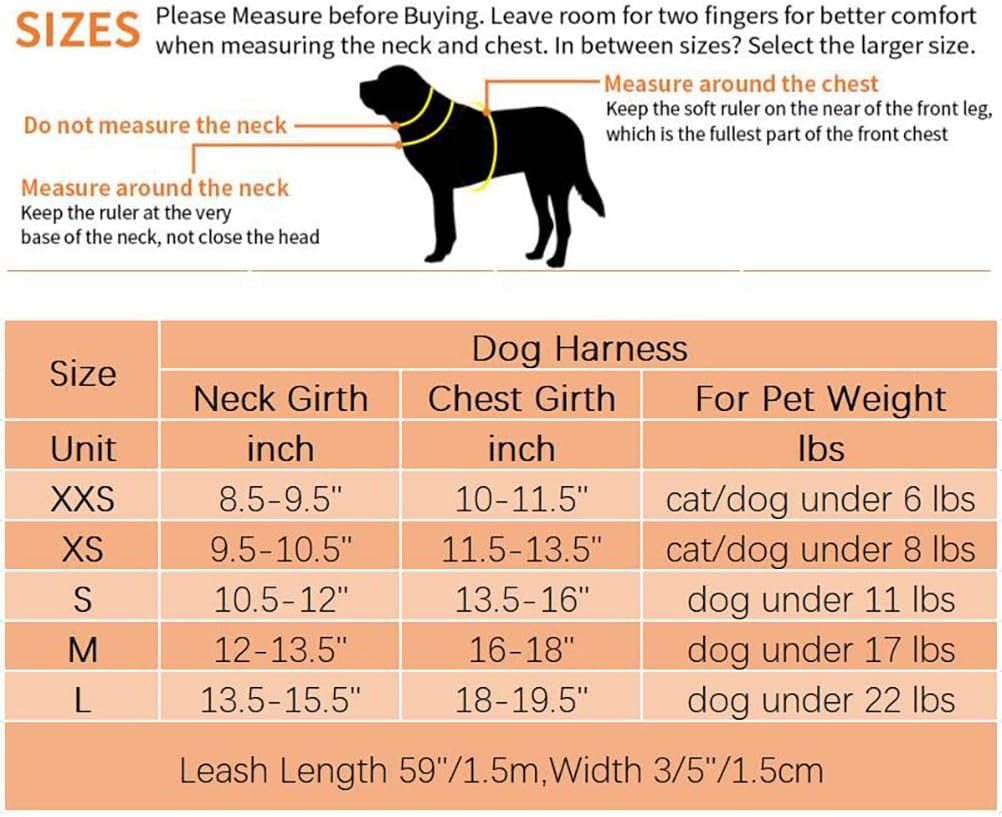 【Small Dog Harness And Leash Set】- The dog leash is made of strong high density nylon rope. Length 5ft width 3/5 inch. it can be individually used with your other harnesses. We are sure your furry friend will love it.