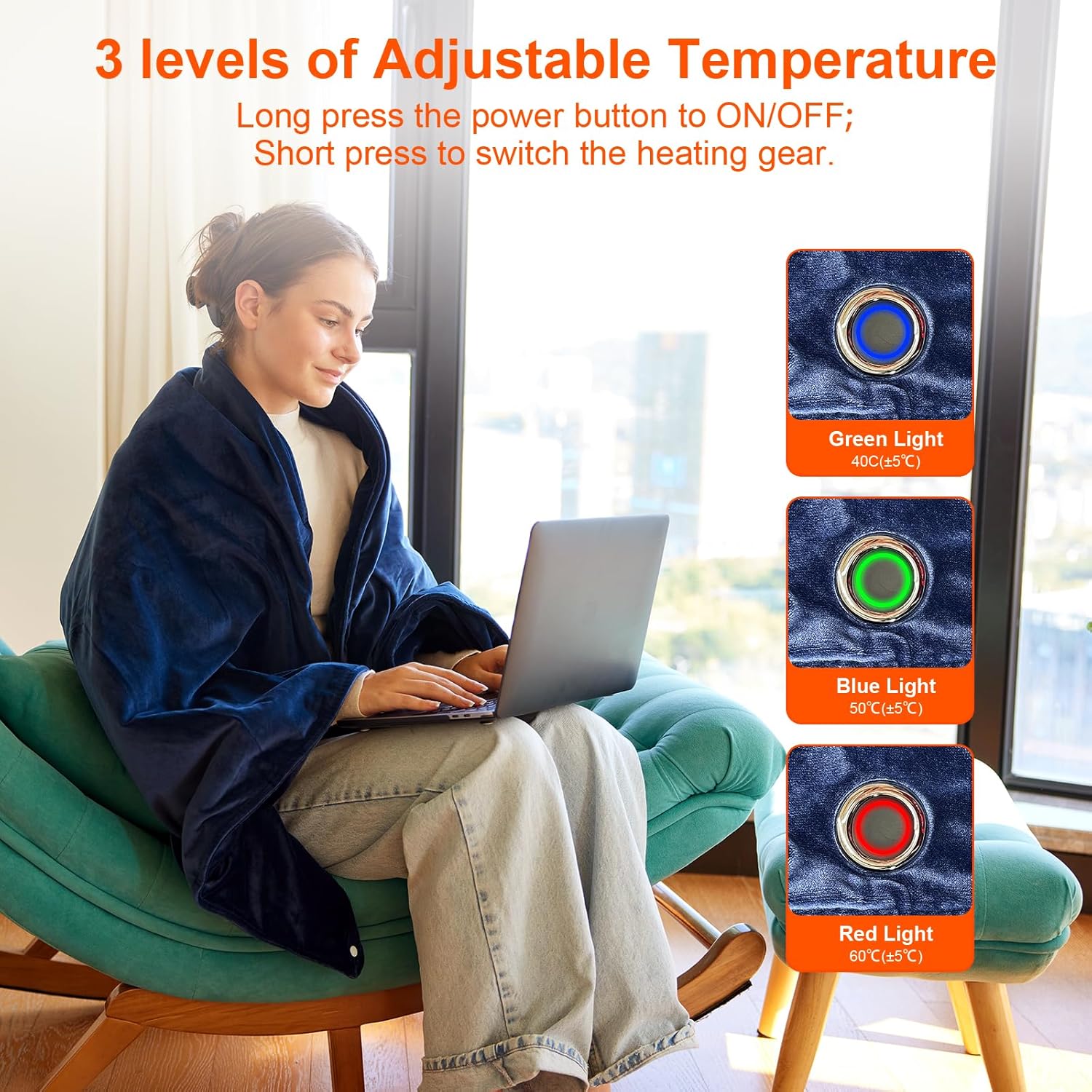 【Three Temperature Settings】: With three temperature level settings (high-140°F, medium-122°F, low-104°F), you can easily adjust the warmth to your preference. The heated throw is compatible with any 5V 2A USB interface, making it convenient to use with power banks, computers, sockets, and more, allowing you to stay warm anytime, anywhere.