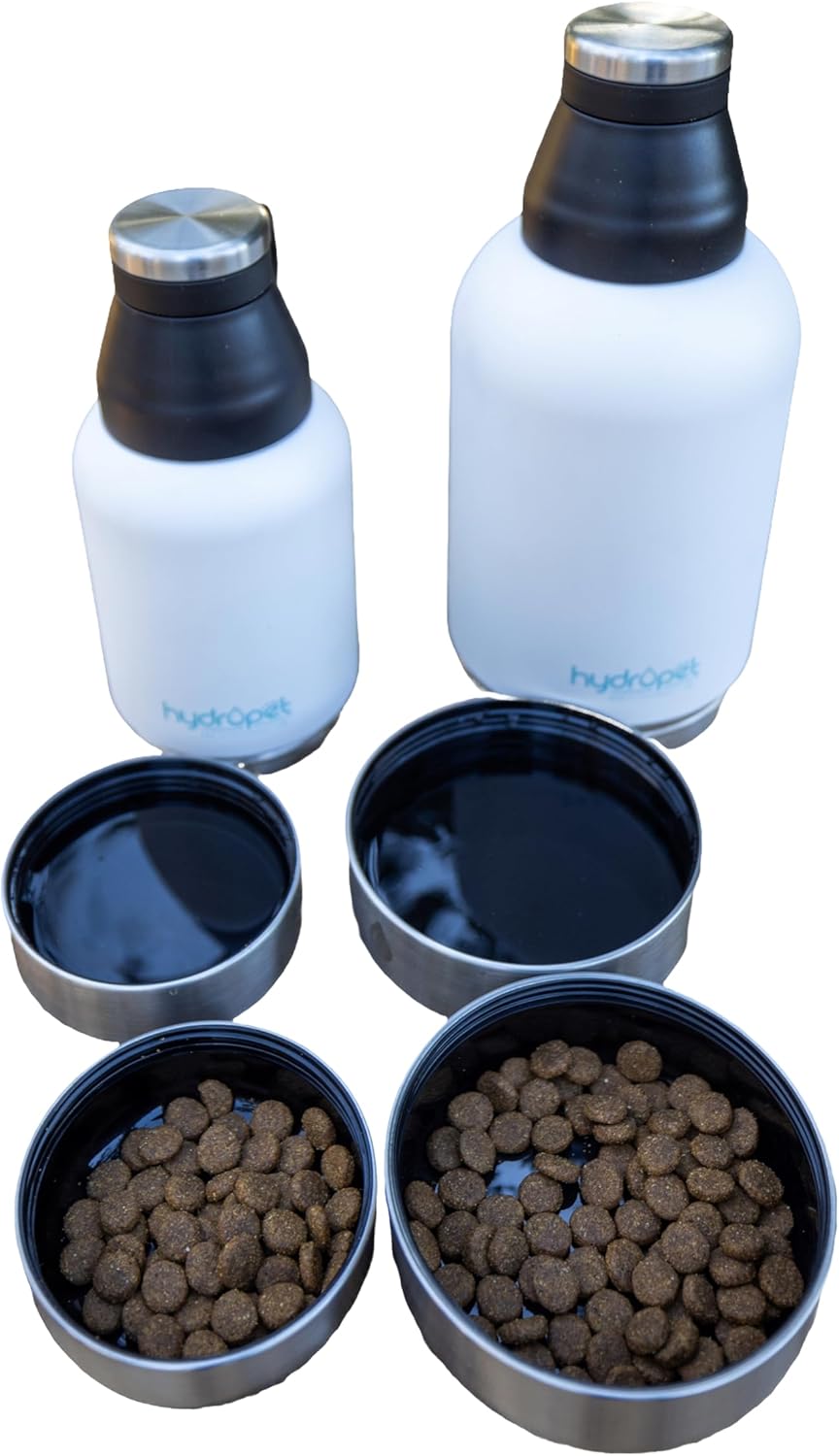 HydroPet Portable Dog Water Bottle & Food Bowl Set, Stainless Steel Travel Flask with Dual Bowls, Carry Bag & Strap – Perfect for Travel, Walking, Hiking – White, 32 oz