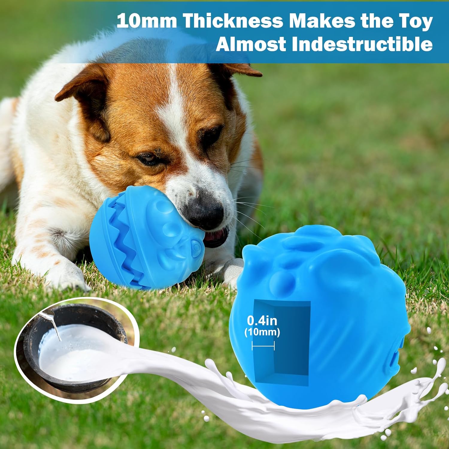 Indestructible dog ball: The indestructible dog balls for aggressive chewers is made of upgrade technology and the thickness of dog chew toys balls is more than 0.4 in. What’s more, we’ve thickened the area where dogs usually bite of dog ball toy. The durability of treat dispensing dog toys is very good. Tough dog toys for aggressive chewers can fully withstand prolonged chewing. Dog balls are best indestructible dog toy for aggressive chewers