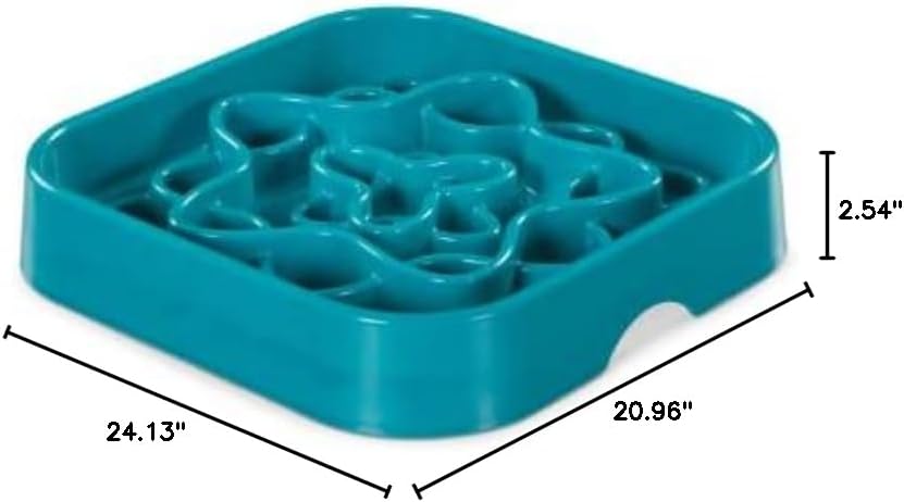 We recently adopted a large breed mixed mutt. During feeding he would quickly devour his food in a fury. This bowl slows him down considerably, and lets him problem solve for just a few seconds about how he’s going to get the last few morsels out of the nooks. We feed both kibble and raw food (freeze dried with warm water) and he will lick this clean. It feels durable, doesn’t slide around at all and is the perfect size for our growing boy. The color is really nice and it tucks away nicely under his raised water bowls. Great buy!