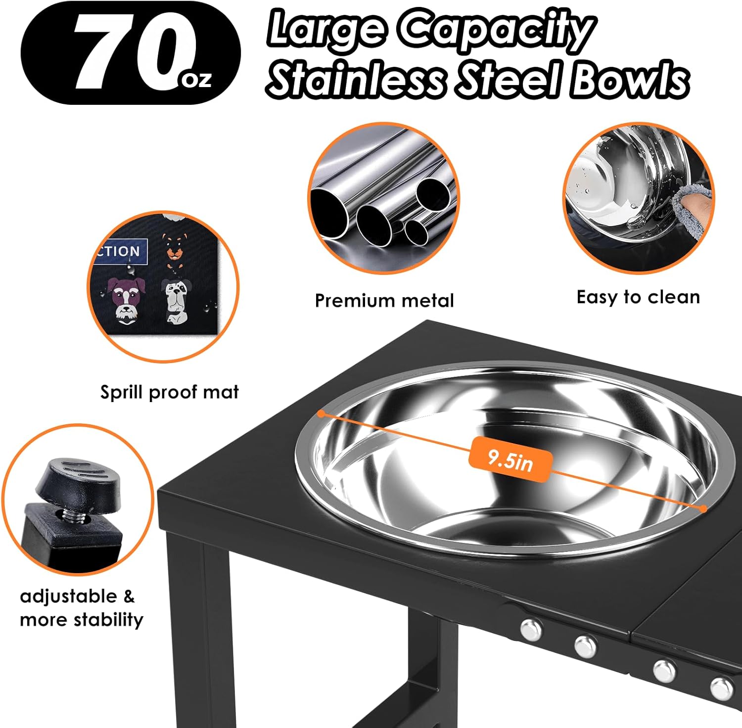 【EASY TO ASSEMBLE】- Taking only 2 minute to assemble, the dog bowl set includes 2 food-grade stainless steel dog bowls (67oz-2000ML), a splash proof mat (20×32 inches), and other assembly accessories