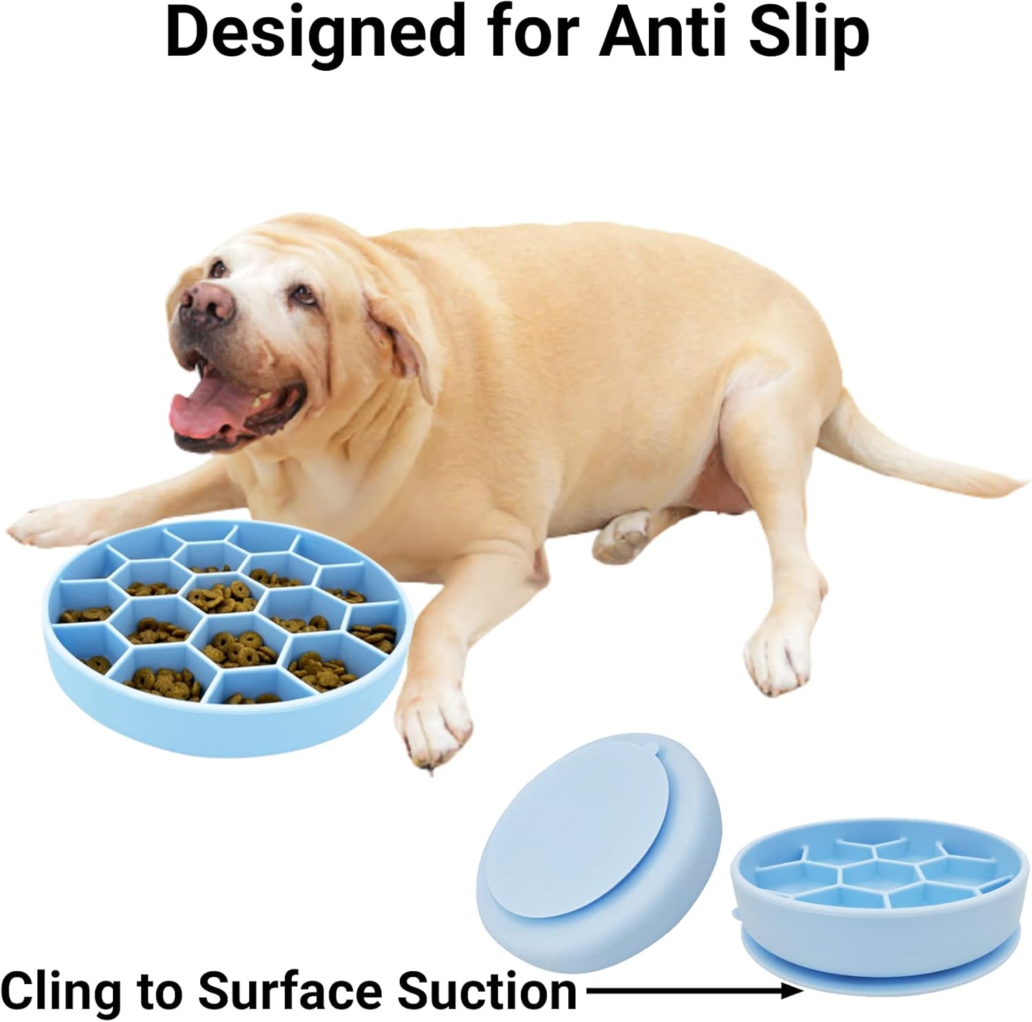This silicone slow feeder is amazing. I like that it has a lot of room so I can rehydrate my dog’s kibble. It has one big suction on the bottom, so it does not move around when my dog is eating.Use this almost daily! I should probably pick up another one! I got the larger size, which is perfect for my 60lb German Shorthaired Pointer.Easy to clean, unless you let the food sit on it and then you gotta get in the crevices.