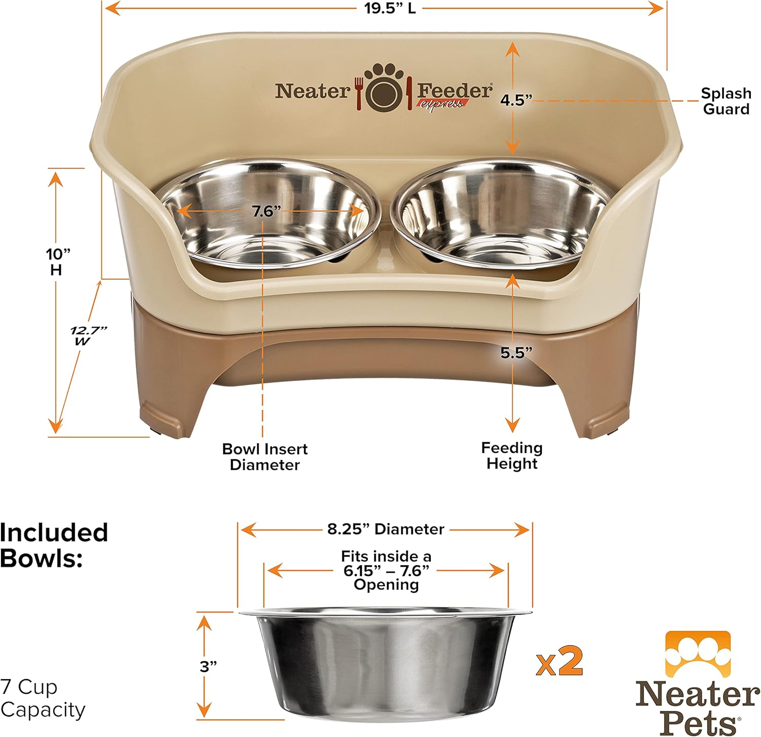 MADE FOR MEDIUM TO LARGE DOGS: Our spill-proof elevated dog bowls are designed for medium to large dog breeds over 9 inches at the shoulder & over 18 pounds in weight. The feeding height of this model is 5.5” tall. Includes two stainless steel dog bowls, each with a 7-cup capacity. NOTE: The Neater Feeder Express is NOT compatible with any leg extensions. If you want to add leg extensions to your raised dog feeder, please check out our Deluxe model.