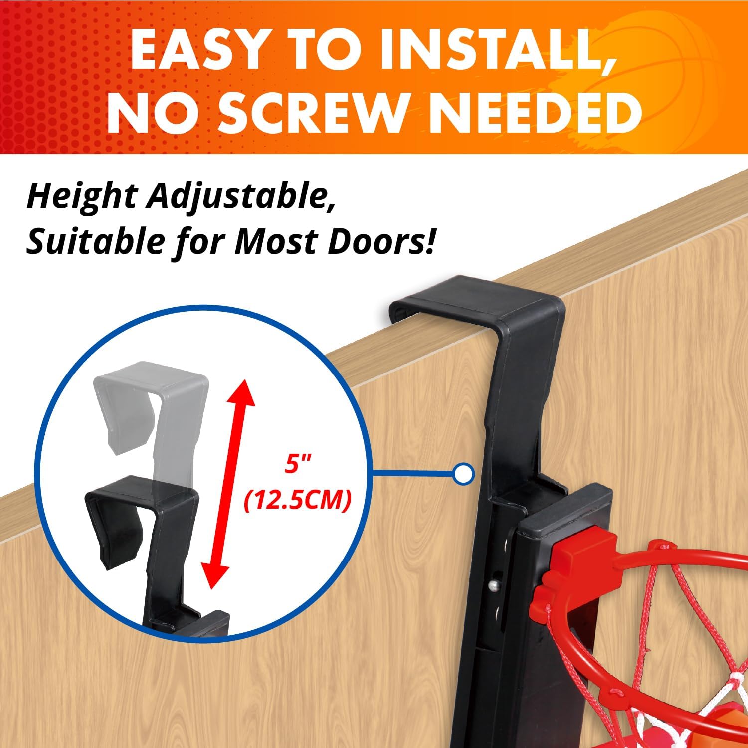 Effortless Installation & Adjustable Height – No tools, no worries! This mini Over-The-Door basketball hoop easily hangs over most doorways with secure hooks. Plus, the adjustable height caters to players of all ages and skill levels, making it perfect for growing and adults alike.