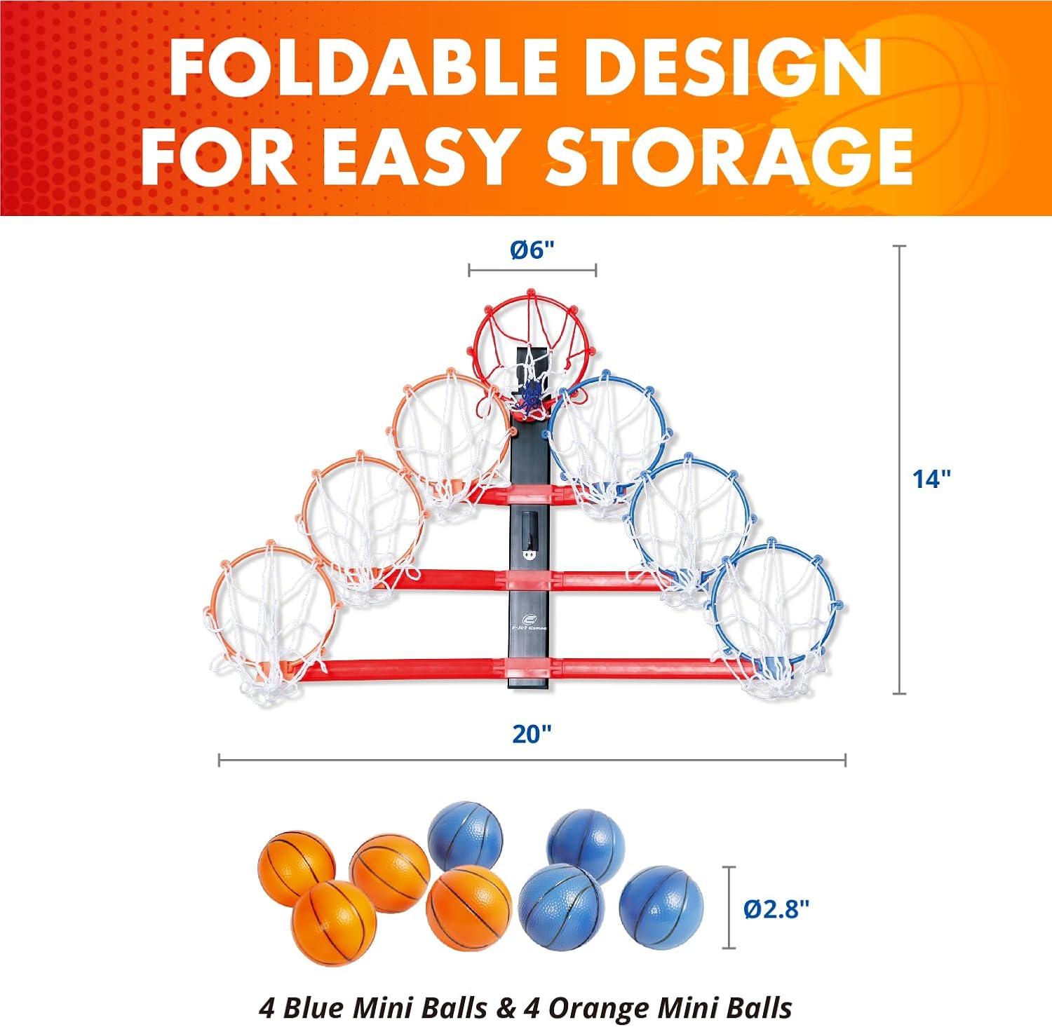 Double the Action, Double the Fun – The E-Jet Games Mini Over-The-Door basketball hoop Race comes equipped with a complete set of 8 mini basketballs (4 blue & 4 orange, 2.8″ diameter). This ensures endless fun for solo practice or epic two-player battles!