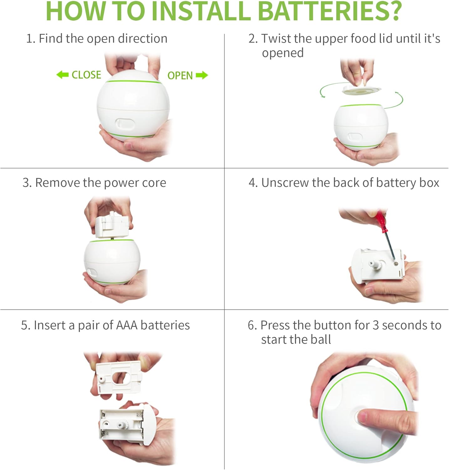 Twist the upper food lid until it opens and screw the rotating cover of the treat dispensing ball.