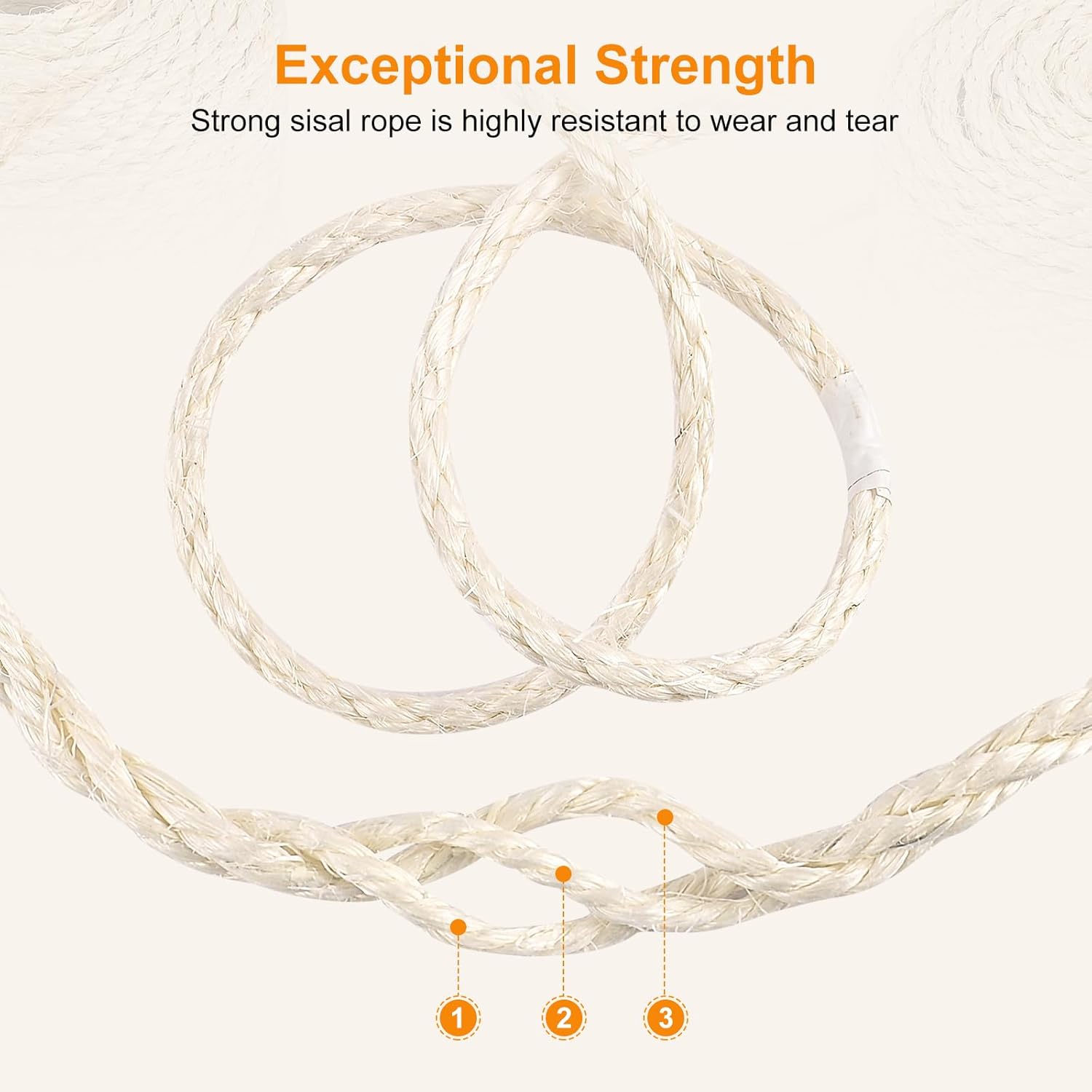 Natural Sisal: Made from the fibers of the sisal plant, our rope is a sustainable and renewable resource. Eco-conscious pet owners can feel good about using our sisal rope to create or repair scratching posts for their feline friends.