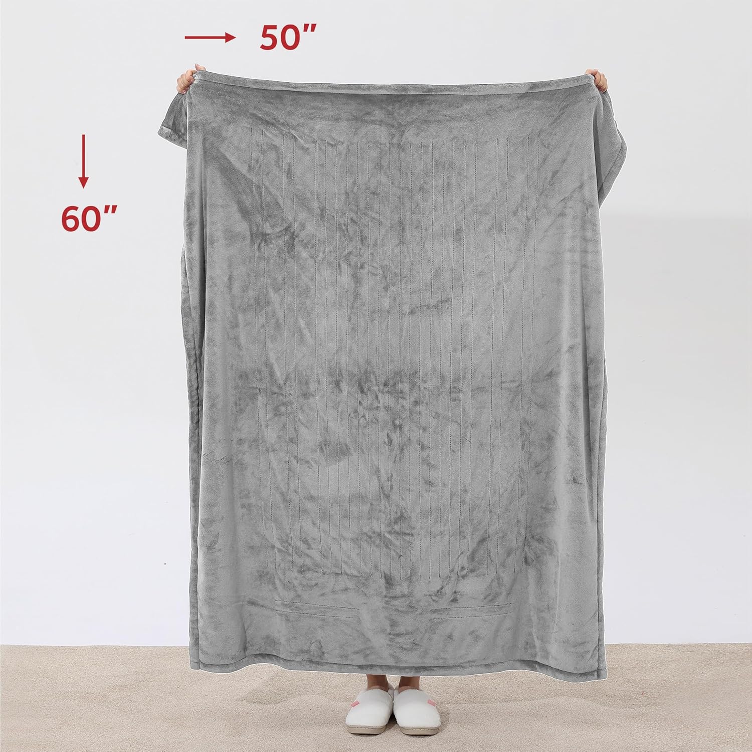 Sunbeam Electric Royal Posh Velvet Heated Throw snuggles you in warmth on chilly nights. Wrap yourself in the lush, silky, and ultra comfy royal posh velvet fabric that keeps you toasty warm as you relax at home. This stylish Dove grey color adds a vibrant touch to any decor, making this 50″ x 60″ electric blanket a great addition to your couch, bed, or favorite chair. The throw features an easy-to-use push button controller with 4 adjustable heat settings, so you can find your perfect temperature. It includes a 4-hour auto shut-off function for added safety and peace of mind. The premium heated wires are designed with advanced technology to ensure continuous, safe heat distribution. When ready to clean, simply detach the controller from the throw and place into the washing machine and dryer for easy care, stays soft wash after wash. Sunbeam is an American brand with more than 125 years of history in electric home appliances. All Sunbeam electric bedding products are ETL certified.