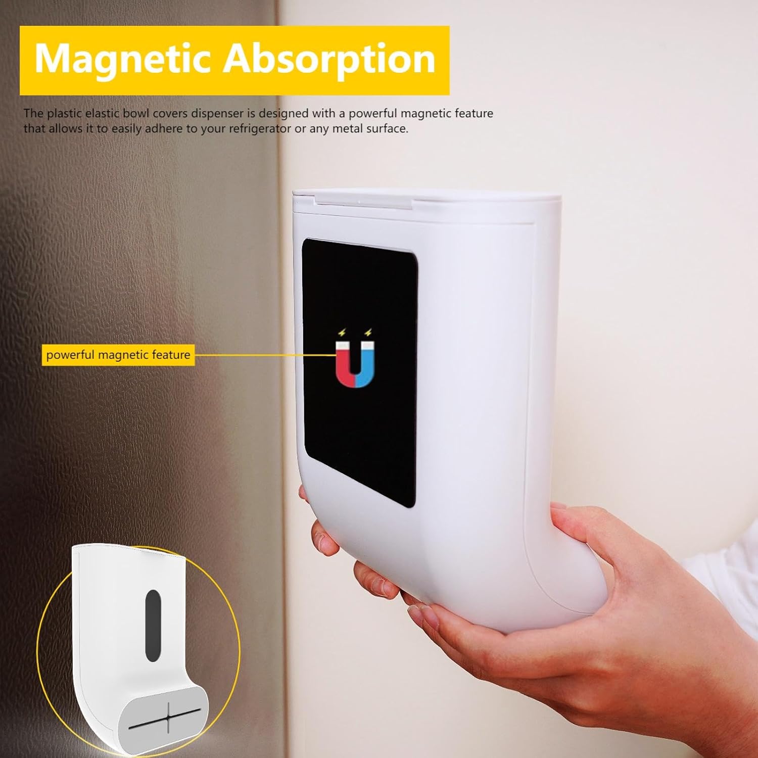 Upgraded Plastic Elastic Bowl Covers Dispenser, Includes 50pcs Food-Grade Plastic Wrap Covers, Magnetic Absorption for Easy Installation & Space-Saving Kitchen Storage Organizer, White