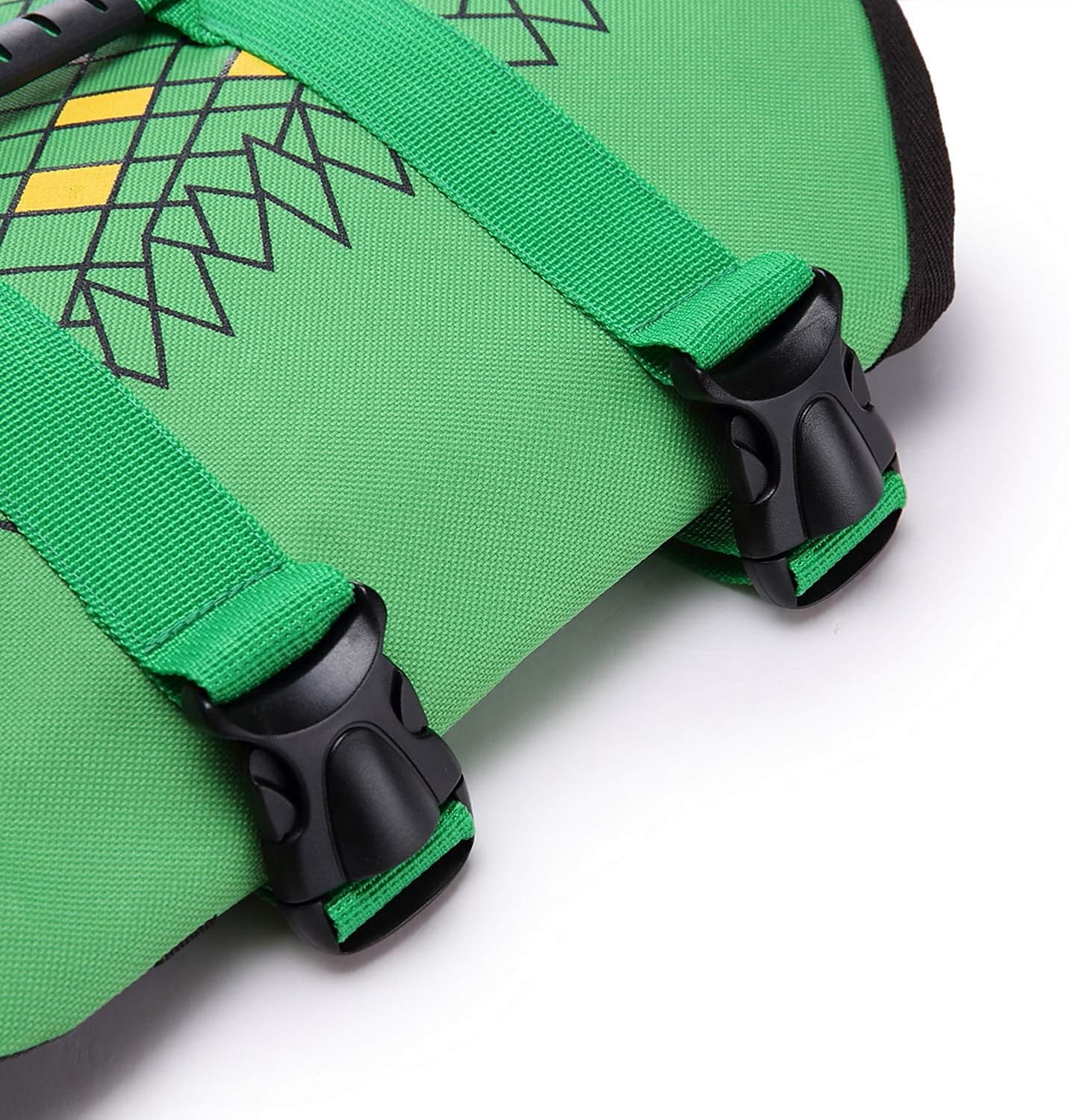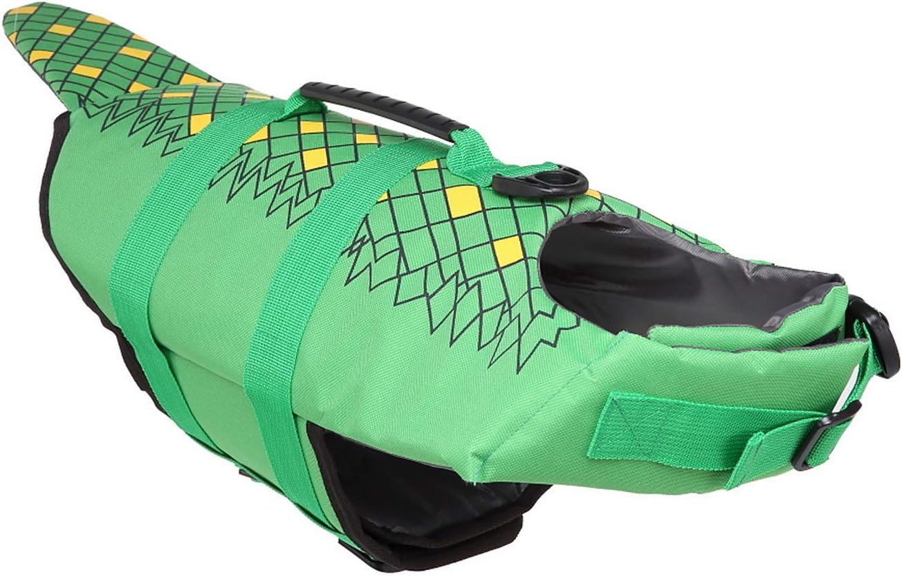 Special Design & Easy to Use — Bright green crocodile shape makes your pet more cute and outstanding. It has adjustable magic straps and quick-release buckles around the belly and neck to keep dog life jacket securely fastened.